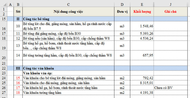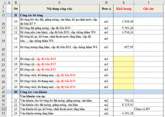 BOQ đúng, cho dù cột vách lõi không thuộc phạm vi tính của Hải nhưng khi nộp khối lượng phải giữ nguyên cấu trúc BOQ, không chèn hàng xóa hàng, các khối lượng không thuộc phạm vi hoặc bằng không thì để trống.