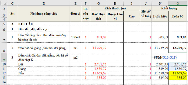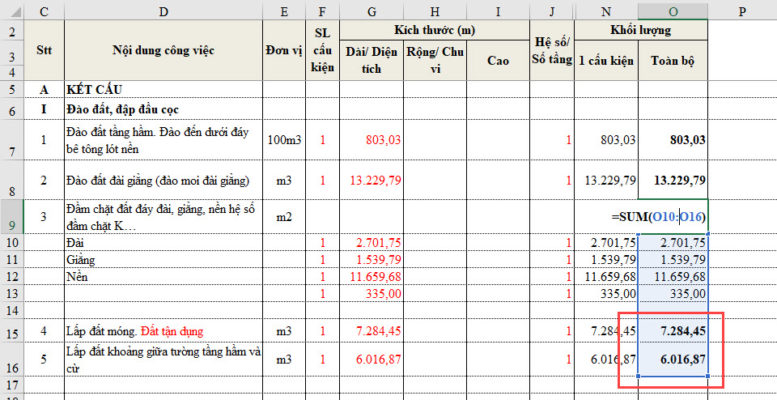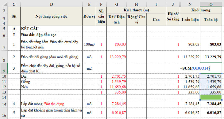 Trong hình ví dụ trên hàm Sum đã bị thừa 2 hàng 15 và 16, đó đều là các khối lượng của đầu việc khác! Dẫn tới khối lượng thừa rất rất nhiều! Hàm Sum cũng hay bị trường hợp thiếu vùng do chúng ta đã Sum rồi nhưng sau đó lại chèn thêm hàng để bổ sung khối lượng nhưng lại quên không điều chỉnh lại phạm vi của hàm Sum: