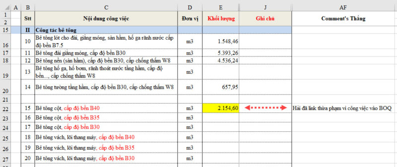 Hải đã link thừa phạm vi công việc vào BOQ – khối lượng bê tông cột