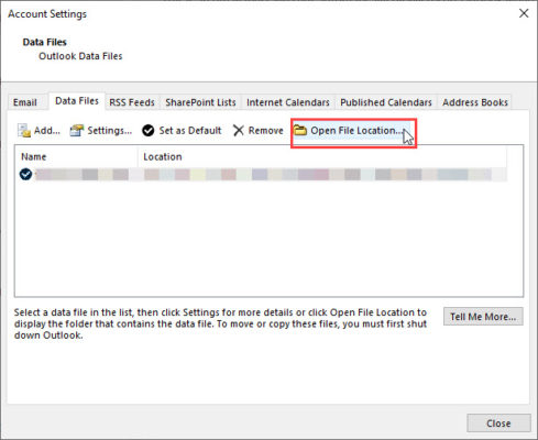 Sau khi bấm Open File Location chúng ta sẽ được trỏ đến thư mục chứa Database của Outlook trên ổ cứng máy vi tính của mình, ở đây bạn copy file Database này về đặt trong ổ cứng một máy tính khác, sau đó tiến hành backup cài đặt vào Outlook tại máy tính này.
