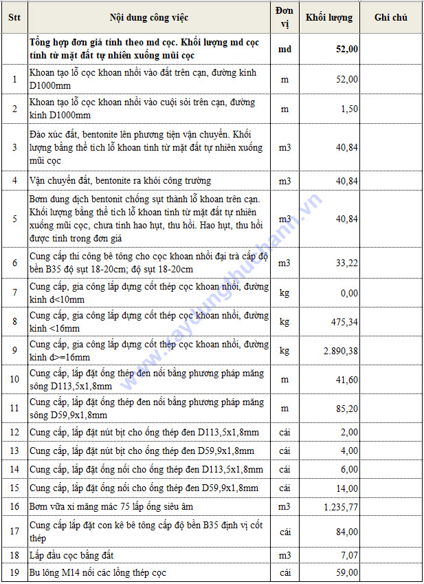 Dưới đây là BOQ cọc khoan nhồi đầy đủ nhưng ngắn gọn nhất đầu việc. Chúng ta có thể rút gọn thêm nữa bằng cách phân bổ các công tác phụ vào công tác chính (cóc kê, cóc nối thép, vữa lấp ống siêu âm), tuy nhiên muốn phân bổ được thì chúng ta vẫn phải tính cụ thể chúng ra sau đó mới phân bổ vào đơn giá công tác chính. Đây là BOQ lập theo kiểu “tư nhân” đo bóc khối lượng và nghiệm thu cực kỳ dễ dàng. Nếu lập dự toán, lập tổng mức đầu tư theo kiểu định mức “nhà nước”, cụ thể là định mức dự toán 1776 thì sẽ phải phân chia ra nhiều đầu việc để có thể áp dụng được định mức, ví dụ công tác khoan phải phân theo chiều sâu khoan <=30m; >30m; khoan đất; khoan đá; khoan vào đá bằng đường kính cọc, khoan cuội đá hơn đường kính cọc => khiến việc đo bóc cũng như nghiệm thu khối lượng cực kỳ khó khăn, có trường hợp không thể nghiệm thu ví dụ đào đất thủ công…