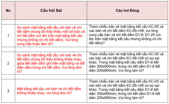 Trong quá trình làm việc các bạn sẽ phải đặt rất nhiều câu hỏi để có đủ thông tin triển khai, đặc biệt trong Xây Dựng thì hỏi rất rất nhiều, hỏi về hồ sơ bản vẽ thiếu thông tin hoặc thông tin giữa các hồ sơ khác nhau thì lấy thông tin nào làm chuẩn…Nhà thầu hỏi tư vấn thiết kế/ tư vấn giám sát/ quản lý dự án; CĐT cũng hỏi tư vấn thiết kế để làm rõ trong quá trình thiết kế; Tư vấn thì hỏi CĐT về nhiệm vụ phạm vi công việc… Các câu hỏi hiện nay phần lớn là bằng văn bản, một số ít được trao đổi thông qua các buổi họp trực tiếp. Nếu các bạn không biết cách đặt câu hỏi hoặc câu hỏi của bạn không đủ thông tin thì người được hỏi sẽ không thể trả lời bạn vì họ không hiểu bạn hỏi gì! Lỗi này nhiều bạn mới đi làm mắc phải! Các bạn xem một vài ví dụ trong hình minh họa bên dưới để nắm được việc đặt câu hỏi đúng quan trọng như thế nào!
