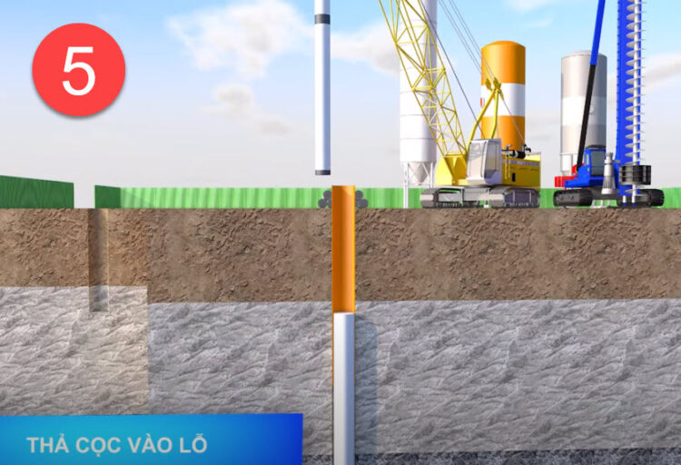 Thả cọc vào hố sau khi đã bơm vữa xi măng