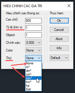 + Nếu để tỷ lệ đơn vị là 1: Kết quả xuất ra sẽ là đơn vị vẽ trong bản vẽ, mặc định là mm2.