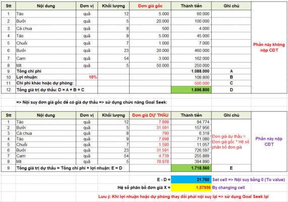 Và nhiệm vụ của Goal Seek là tìm cho chúng ta hệ số X để thỏa mãn công thức giá trị dự thầu không đổi: E = D.